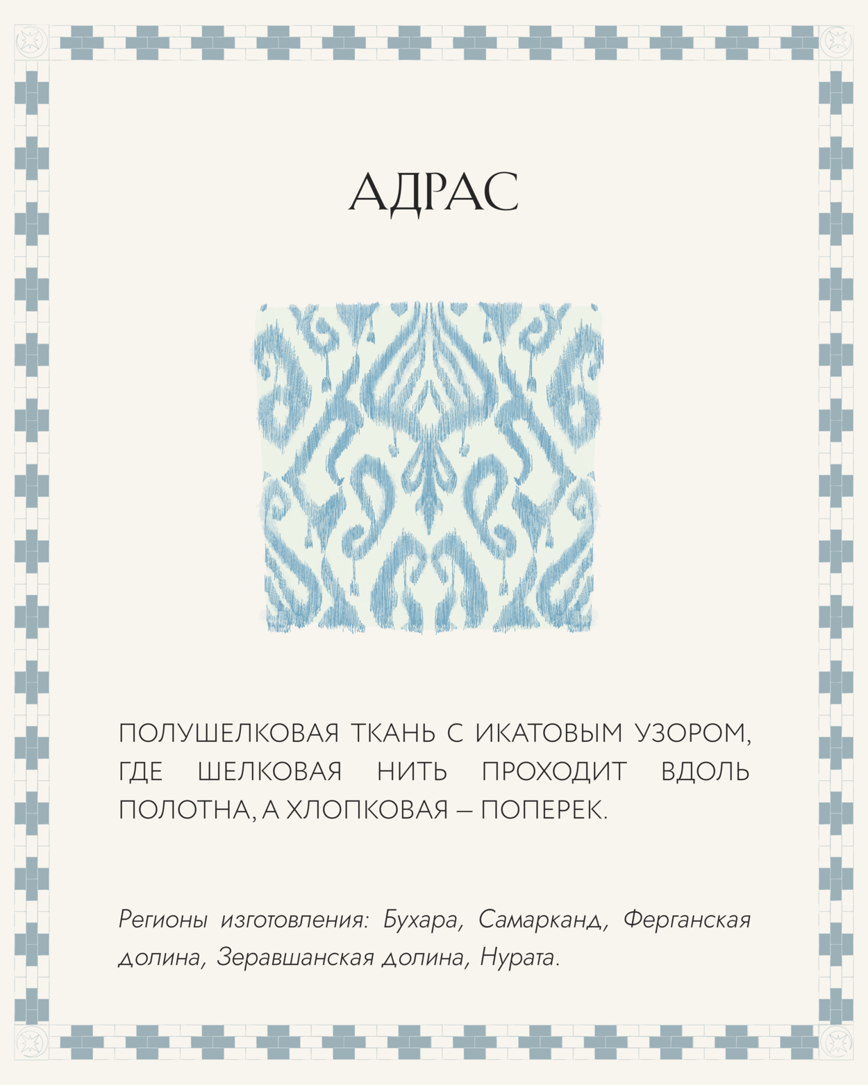 Художественный текстиль Центральной Азии, и особенно Узбекистана, — это древний и важный вид декоративно-прикладного искусства. Традиционные ткани, такие как шелк и адрас, были не только широко известны, но и востребованы на протяжении веков, включая период Шелкового пути.