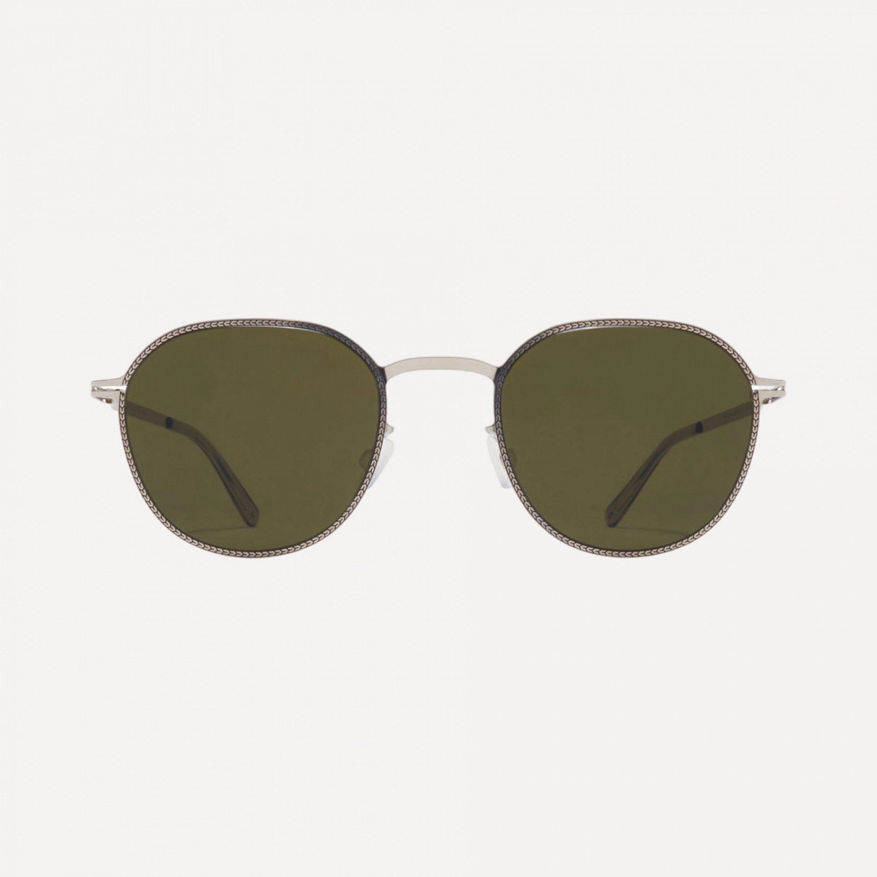 Material: light stainless steelPatented spiral hingeAcetate temple tips and silicone nose pads. Tinted sun lenses with 100% protection against UVA/UVB rays and an anti-reflective inner coating
