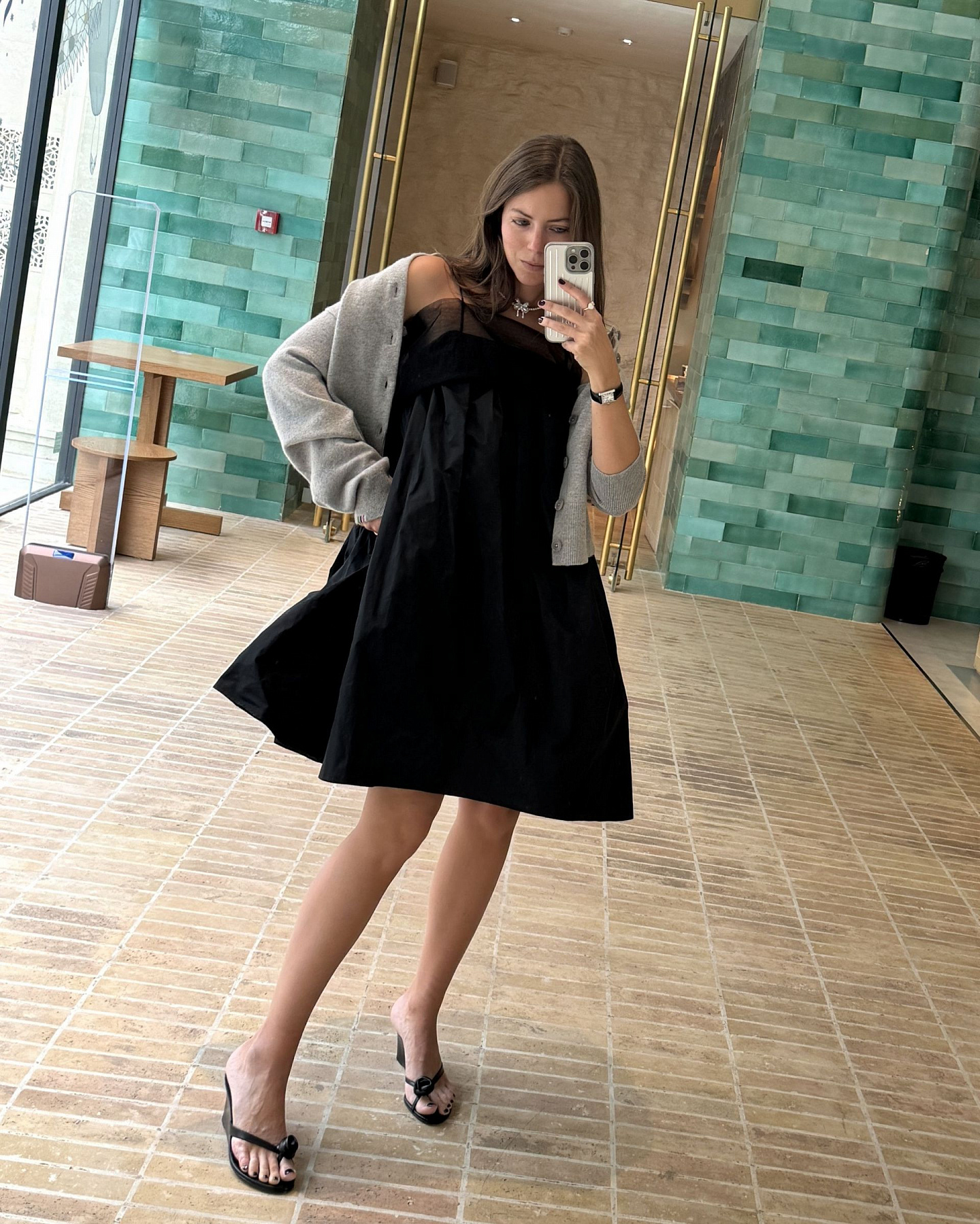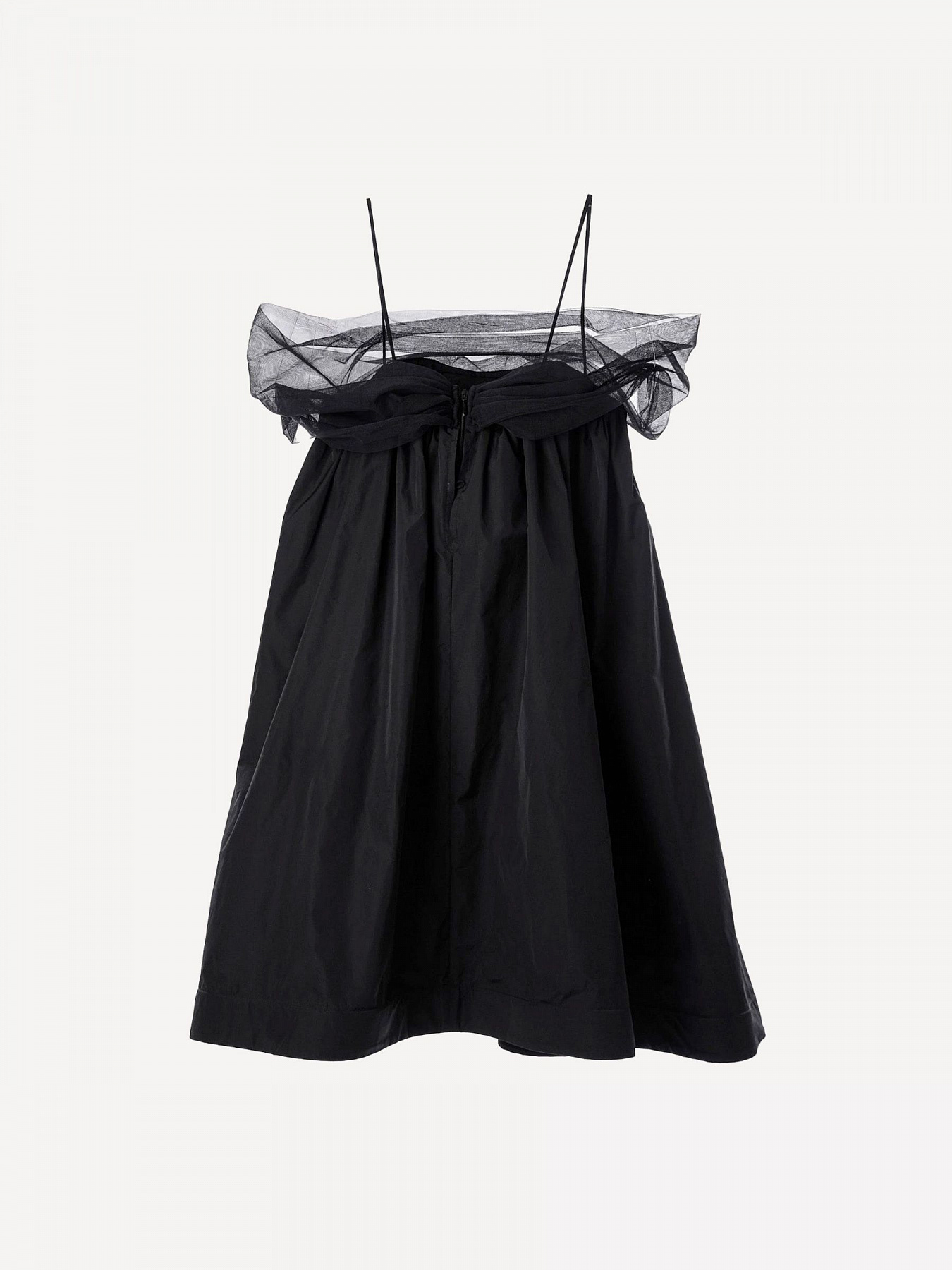 Черное платье-трапеция с бретелями-спагетти и черной сеткой на плечах.