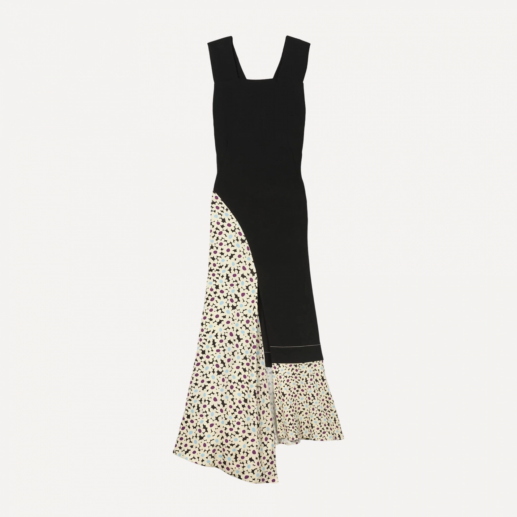 Платье без рукавов с квадратным вырезом и широкими бретелями, перекрещивающимися на спине. Цветочный принт пэчворк органично сочетается с изысканностью однотонного черного крепа. Невидимая молния в боковом шве. Пуговицы с тканевой отделкой.