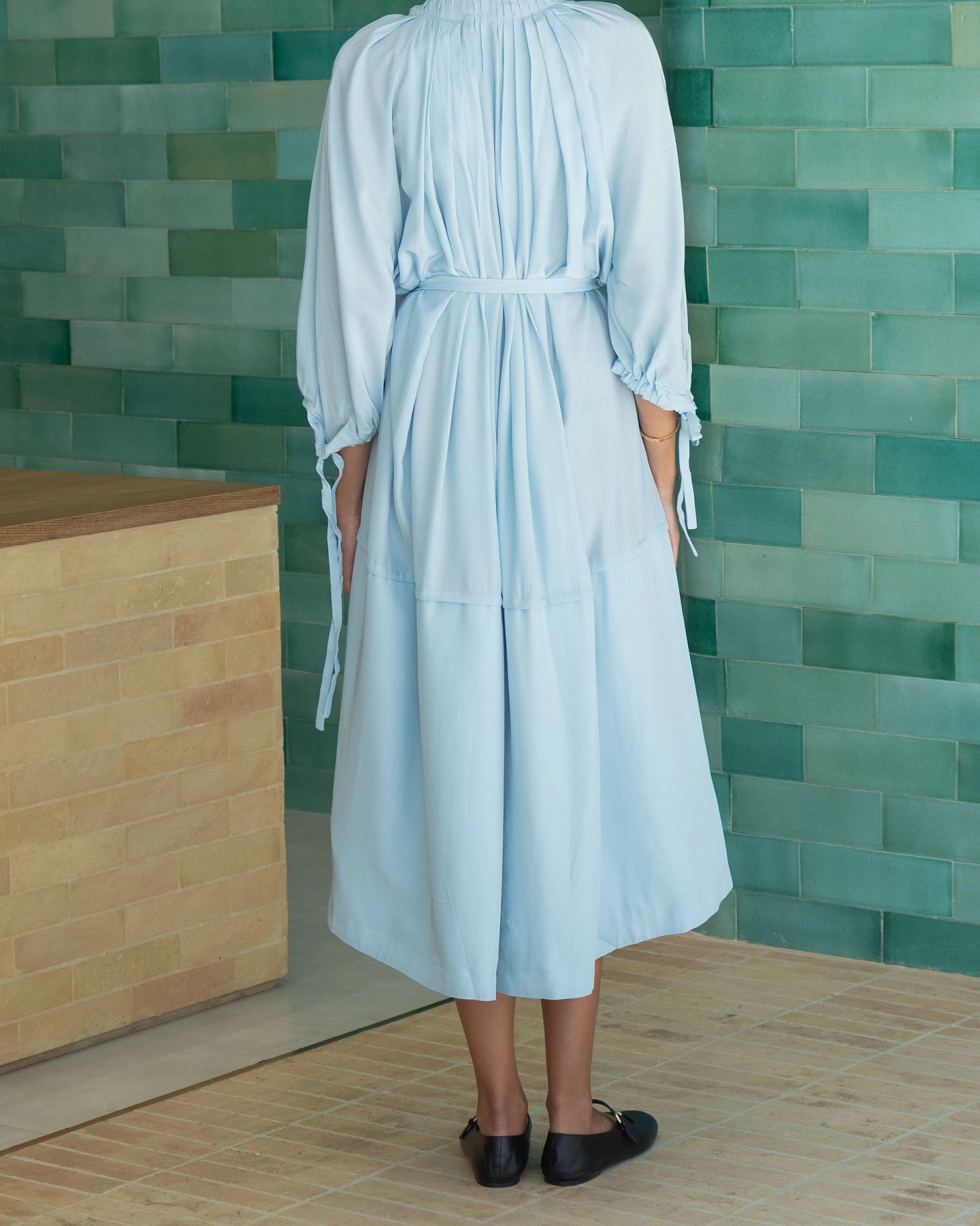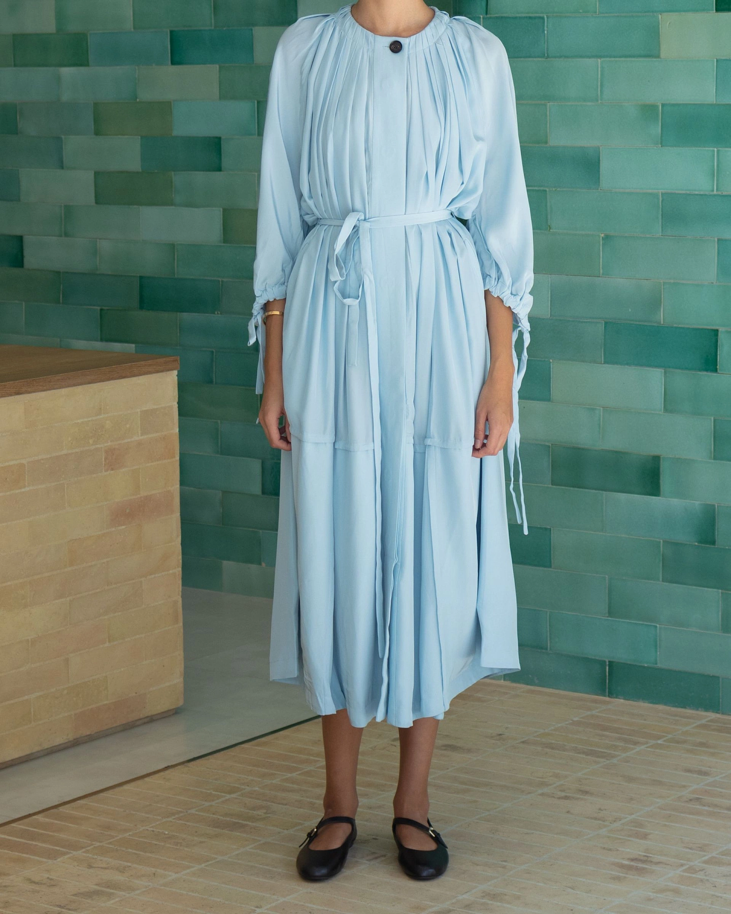 Платье из шелковистой вискозы, плотно прилегающее к телу. Завязки на рукавах и застежка на потайные роговые пуговицы во всю длину. Ярко-голубой цвет делает его отличным выбором для торжественных случаев.