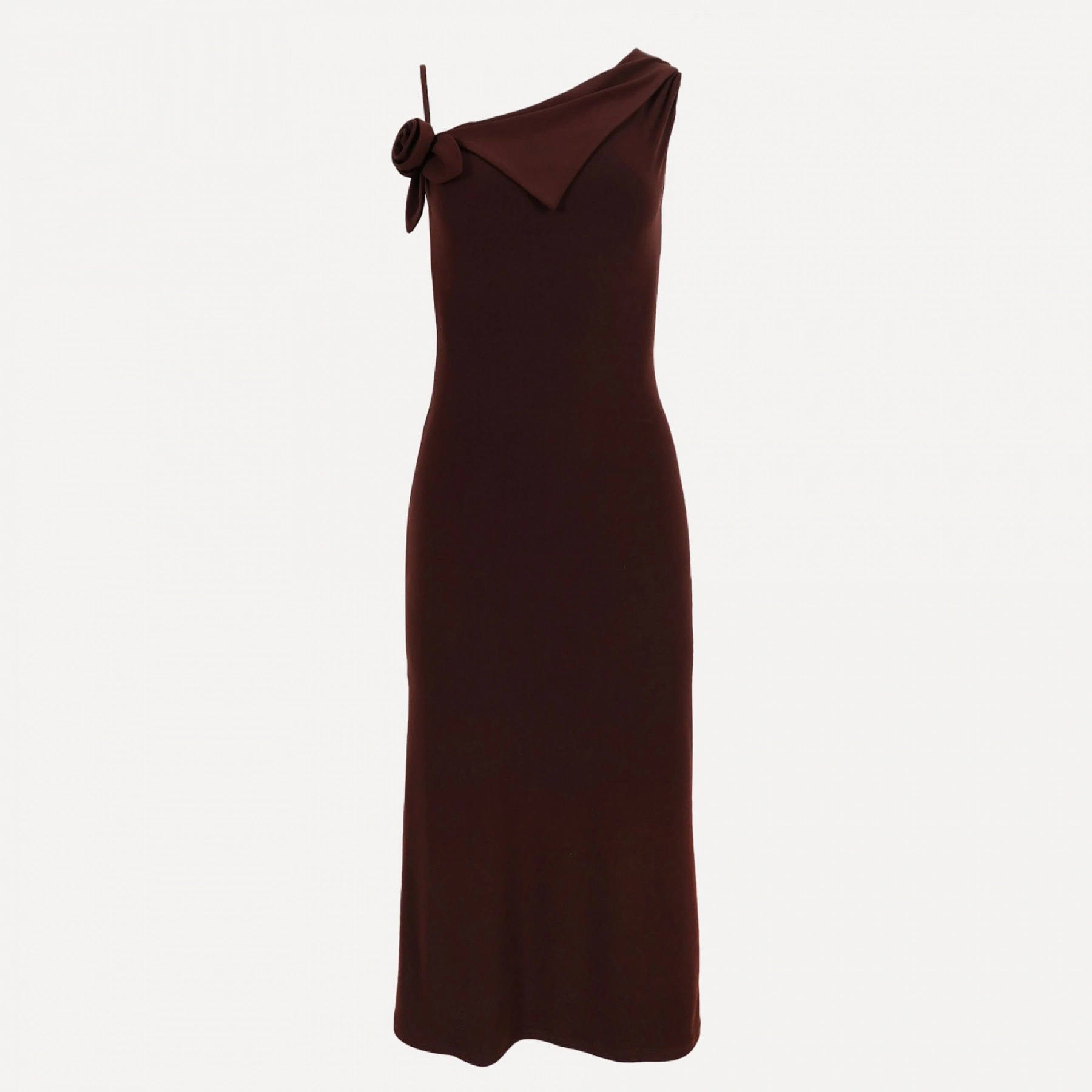 Драпированное асимметричное платье-миди темно-коричневого цвета Изготовлено из мягкой ткани джерси Детали в виде розочек спереди Сделано в Нью-Йорке