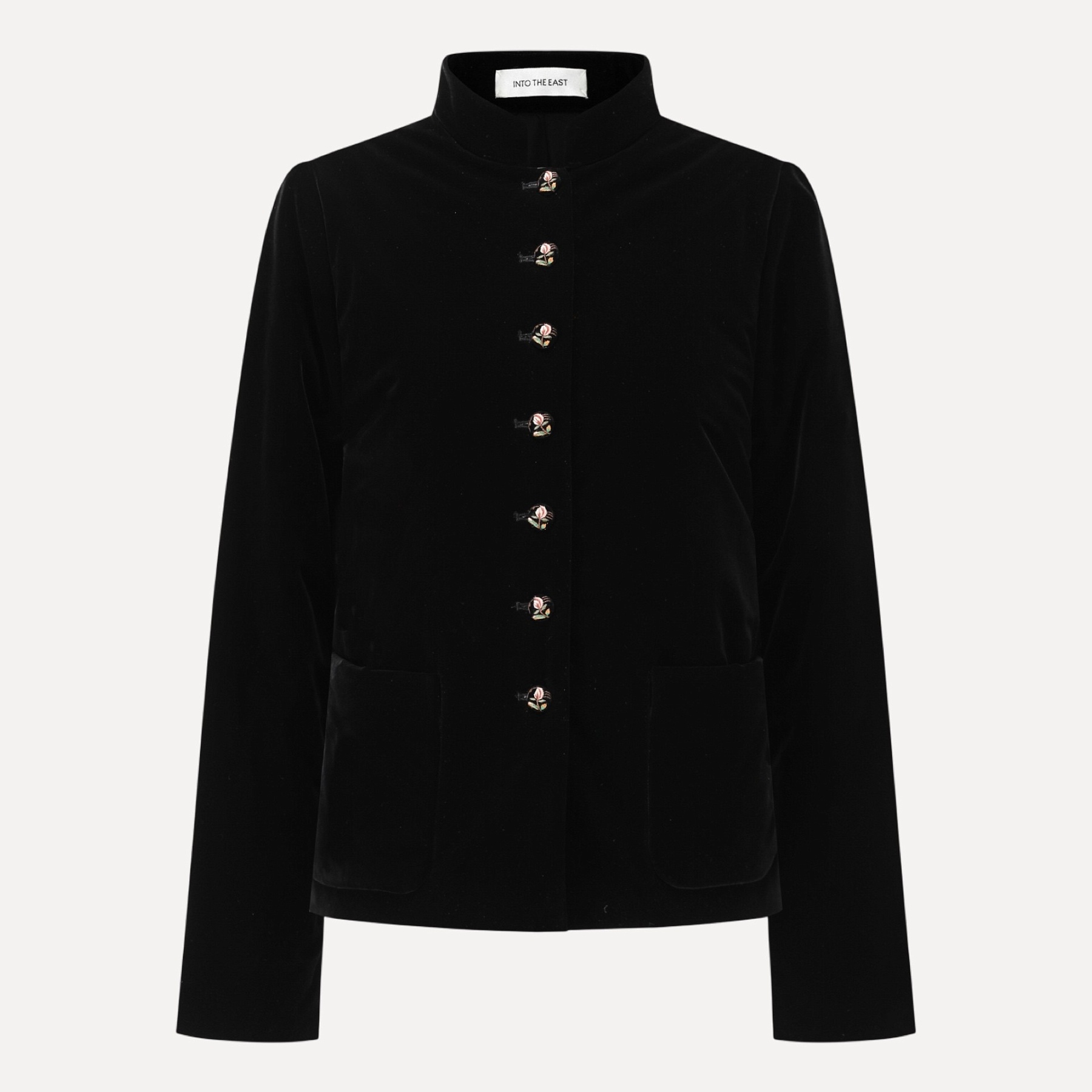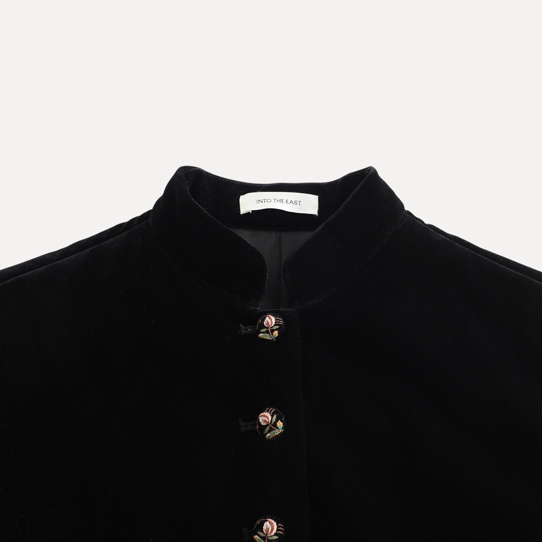 INTO THE EAST Black velvet embroidered flower button stand collar cotton jacket